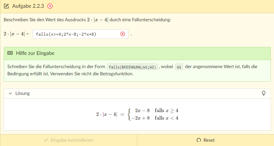 Ich versuche eine der Aufgaben mit dem Thema Betragsgleichungen zu lösen. Wenn ich jedoch mein Ergebnis überprüfe, wird es als falsch markiert, obwohl es mit dem Ergebnis in der Lösung übereinstimmt.