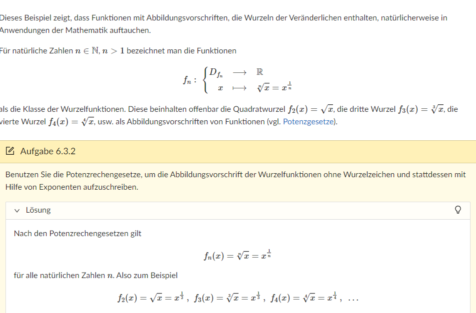 In Kapitel 6.3.2 Wurzelfunktionen steht die Lösung für die Aufgabe 6.3.2 bereits direkt darüber.